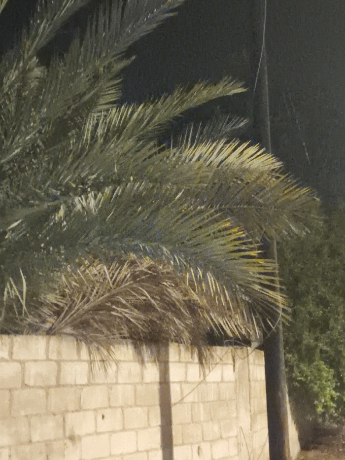 A palm tree dominates the frame, its fronds extending over a pale brick wall. Some fronds appear dried and brown, contrasting with the green and yellow hues of others. A utility pole stands behind the wall, adding a vertical element to the scene. Foliage is visible on the right side of the image, partially obscured by darkness. The overall lighting is dim, contributing to the somber mood of the image.