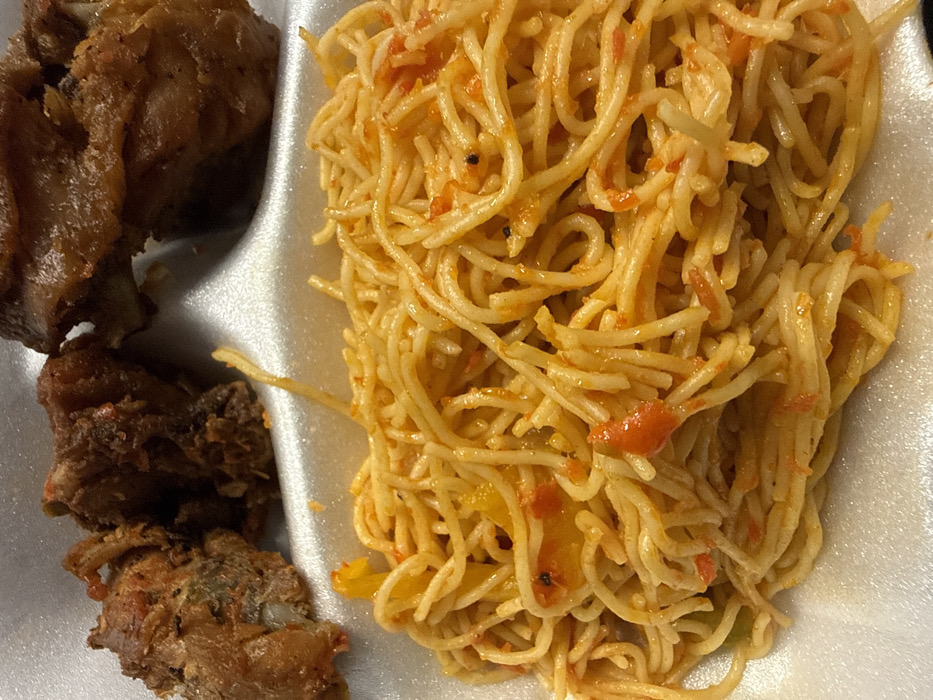 The image displays a close-up, overhead view of a takeout meal in a white, compartmentalized foam container, located in Loganville, United States. The upper section contains three pieces of dark brown, fried poultry or meat, exhibiting a textured, crisp appearance and visible bone structures. The lower, larger section is filled with a substantial portion of spaghetti, coated in a vibrant orange-red sauce containing small, irregular chunks of red vegetables, consistent with tomatoes or peppers. The spaghetti strands are intertwined and uniformly coated. No individuals, actions, or specific environmental details beyond the container are visible.