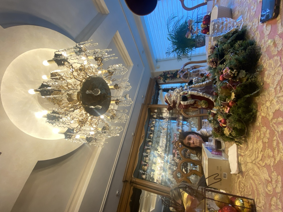 A bright room features a large crystal chandelier hanging from a circular recess in the ceiling. A young woman peers over a box on a table adorned with a floral tablecloth. A decorative Santa Claus figure and a wreath centerpiece are also on the table. In the background, a cabinet displays various ornaments and decorative items. The ceiling has a blue hue, likely from skylights.