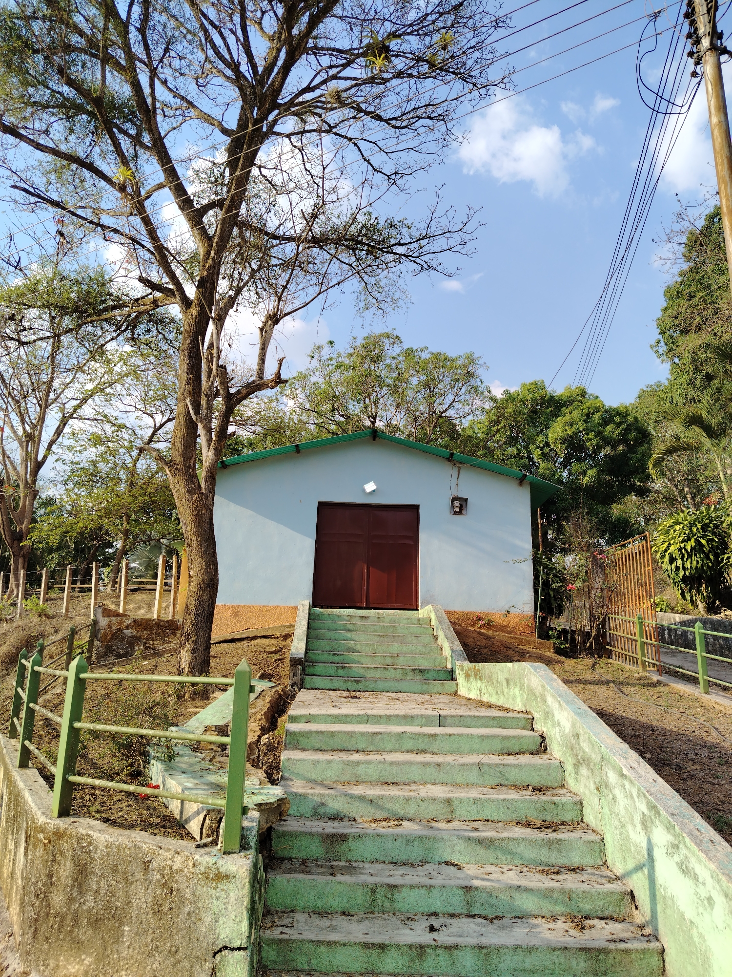 A building with a pale blue exterior and a dark green roof sits atop a small hill in a probable rural area near Los Leoncitos, Venezuela. The building has two brown doors and a small square window on the right side. A large tree is on the left of the building, partially obscuring it. A set of concrete stairs with a green-tinged weathered surface leads up to the building. The stairs have low walls on either side. A green wooden railing is present on the left side of the stairs. The surrounding environment includes trees, some bare and some with green foliage, and a dry grassy area. A wooden fence is seen on the left side of the scene. An electrical pole with wires is visible in the upper right corner. The sky above is blue with scattered white clouds.