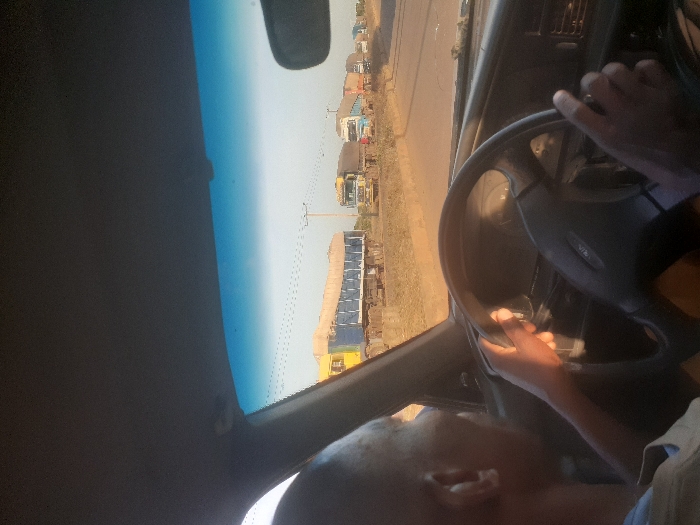 An image captured from the interior of a vehicle depicts a driver with hands on the steering wheel, looking forward onto a road scene in the city of Unknown, Nigeria
