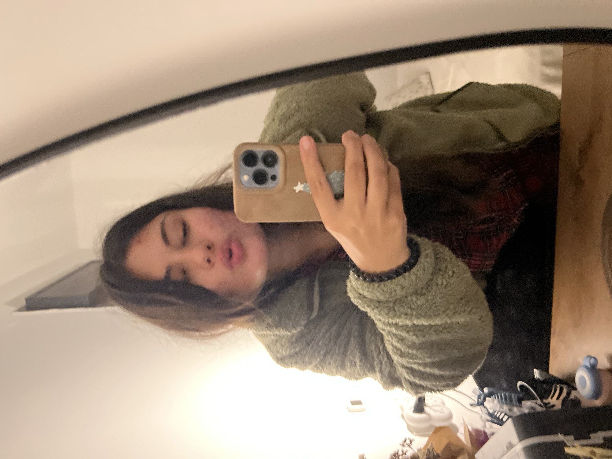 A young woman takes a selfie in a mirror. The woman has dark hair and is wearing a fuzzy green jacket over a red and black plaid shirt. She is holding a phone with a tan case and a star sticker. The background is a cluttered bathroom counter with toiletries and other items. It is impossible to ascertain if the location of the bathroom is in Kiryat Bialik, Israel from the image.