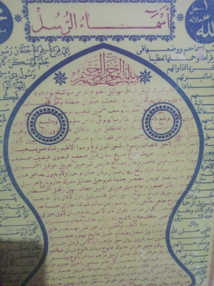 The image displays a close-up, top-down view of a document, likely a printed page, adorned with extensive Arabic calligraphy