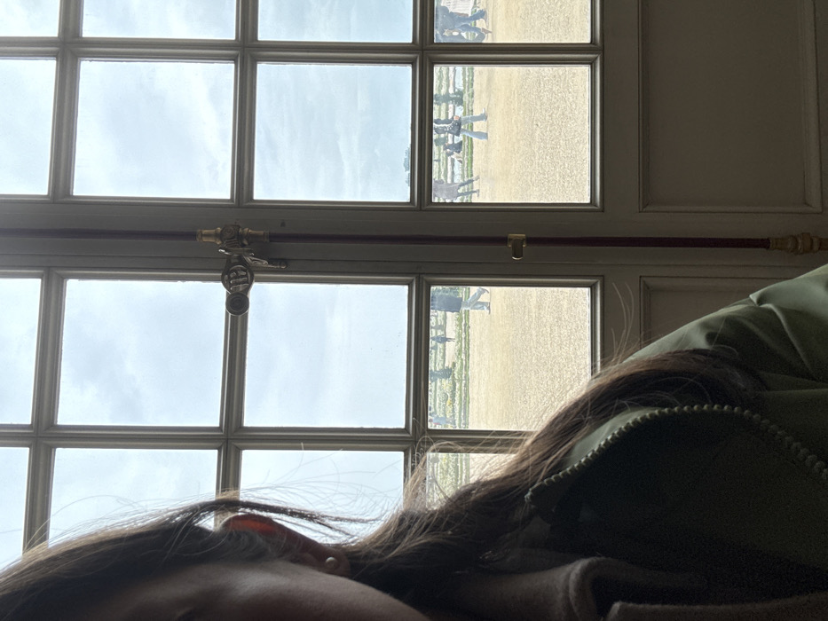 The image presents a partial, eye-level indoor view capturing the left side of a person and an ornate window overlooking the Gardens of Versailles in Versailles, France. The foreground shows the left profile of a person with dark brown hair, a small white pearl earring on the earlobe, and the upper portion of a light green zippered jacket over a lighter-colored undergarment. The central and right segments of the image are dominated by a multi-paned window with light-colored wooden frames. A prominent, ornate brass latch is centered on the vertical division of the window. A slender, dark red vertical rod, equipped with brass fittings, is affixed to the central window frame. Through the window, an outdoor environment under an overcast sky is visible. The ground immediately outside consists of light-colored gravel or packed earth, extending into areas of green grass and structured garden beds featuring yellow flowers in the distance. Several indistinct human figures are distributed across the outdoor garden, appearing to be walking or standing.