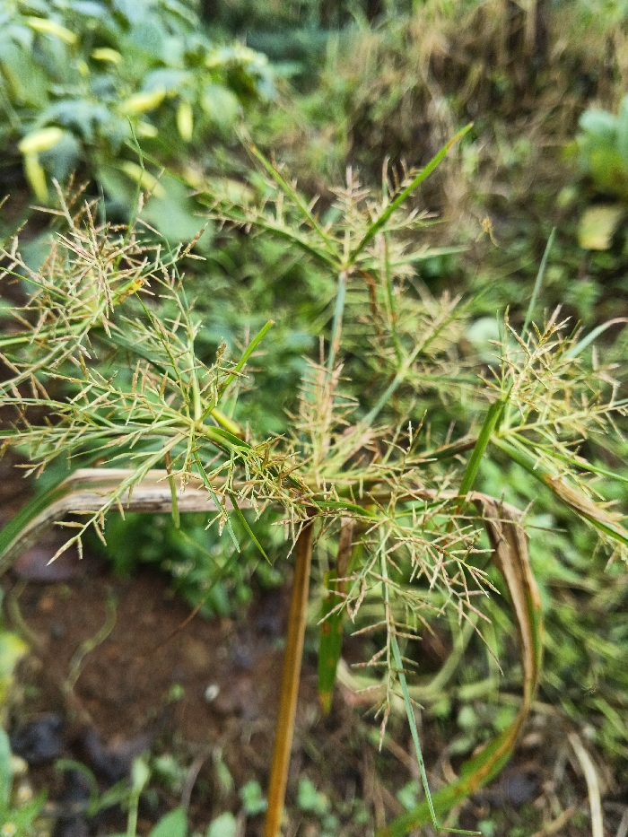 A close-up captures a clump of green and brown Cyperus grass. The grass features thin, cylindrical stalks topped with radiating clusters of narrow, spiky leaves. Fine brown seed heads are visible among the green foliage. The backdrop includes blurred greenery and exposed soil, indicating a natural outdoor setting. The image focuses on the texture and structure of the plant, highlighting its intricate details.
