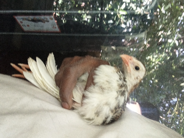 A juvenile fowl, primarily white with mottled dark brown markings, is held in a human hand against a light beige fabric surface