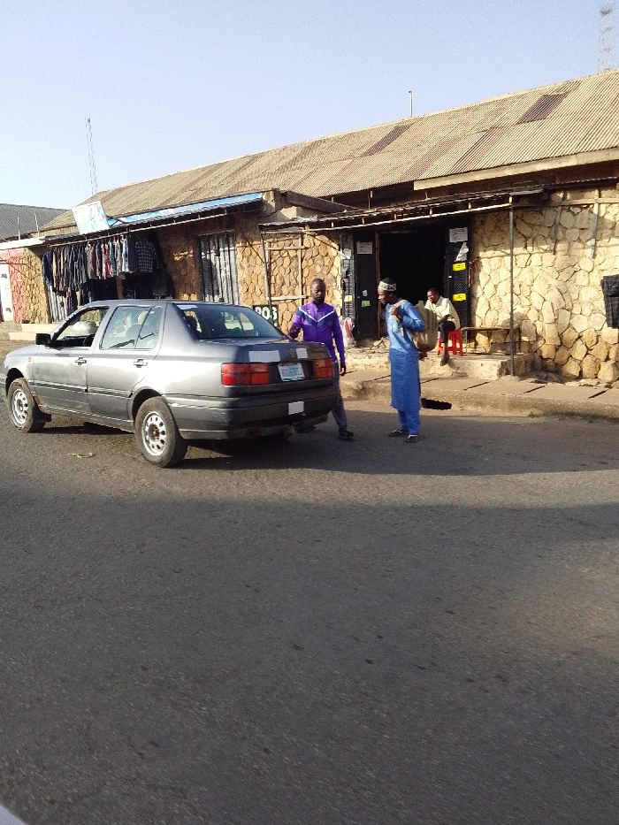 A gray sedan is parked on the side of a road in front of a stone building with a corrugated metal roof. Two men stand by the car, one wearing a purple shirt and the other in a blue robe and hat. Another man is sitting on a red stool at the entrance to the building. Clothes hang on a rack outside the building to the left of the car.