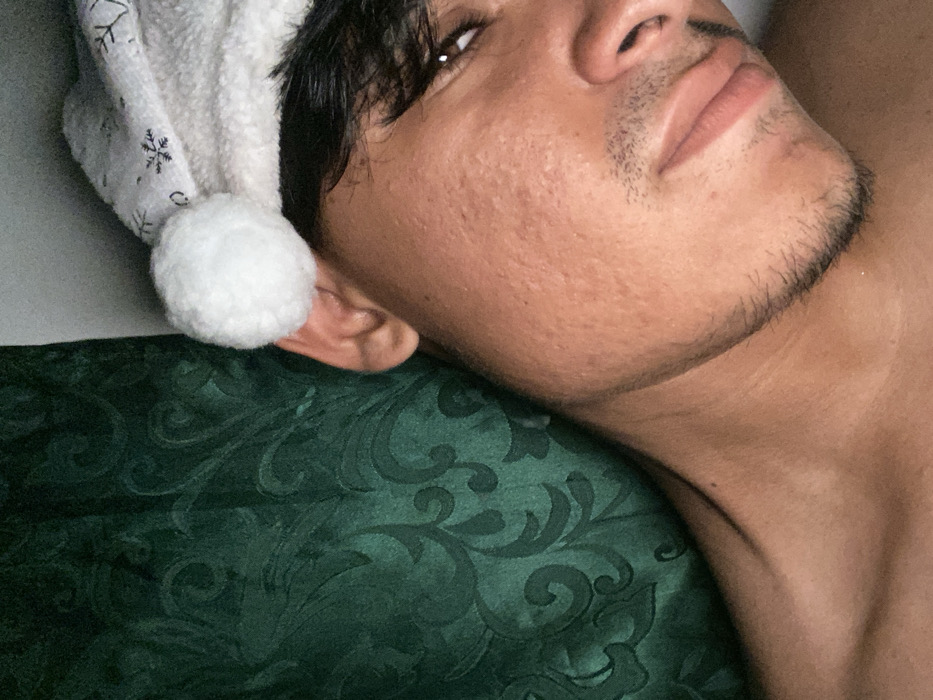 A close-up depicts a person with brown hair wearing a white Santa hat with snowflake patterns. The individual reclines on a green, patterned cushion or pillow. The angle highlights their eye, cheek, lips, and stubble. Skin imperfections and texture are visible. The person's clavicle and bare shoulder are partially shown, suggesting they are shirtless or wearing a low-cut garment. Lighting emphasizes facial contours.