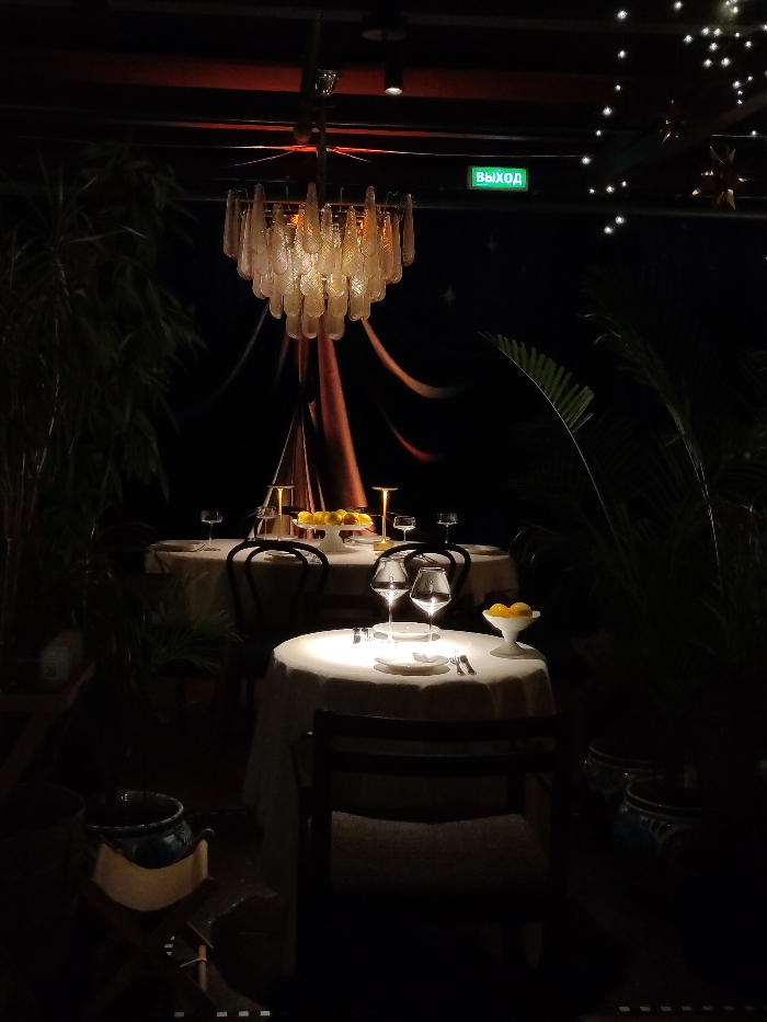 The image portrays an unoccupied, dimly lit interior dining or event space in Saint Petersburg, Russia. A large, ornate chandelier, constructed from numerous illuminated, amber-toned glass teardrop elements, hangs centrally from the ceiling. In the upper right background, a green illuminated exit sign displays the Cyrillic word "ВЫХОД" (VYKHOD). The foreground features a round table draped with a white tablecloth, brightly illuminated from above. It is set for two with two clear wine glasses, white plates, forks, and knives. A small white pedestal dish holds several yellow citrus fruits, and miniature salt and pepper shakers are also present. Behind this, two more round tables with white tablecloths are visible. The central mid-ground table is similarly set, prominently featuring a larger white pedestal dish filled with yellow citrus fruits, flanked by two slender golden decorative elements. Chairs with dark frames are positioned at the tables, including an upholstered chair in the foreground and bentwood-style chairs further back. The environment includes several large, leafy potted plants, one on the far left and another on the right, contributing to a lush ambiance. The background is dark, possibly composed of dark walls or drapes, with wavy brownish-orange fabric elements visible behind the central table. Small, scattered white lights resembling fairy lights and several star-shaped decorations are visible in the upper right background. A decorative ceramic pot in a stand is located in the lower-left foreground, and part of another patterned pot is visible on the right. The overall scene suggests a private or romantic dining setup in an upscale, dimly lit venue.