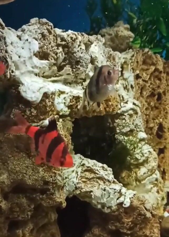 several fish swimming around in an aquarium. The fish are small and have stripes on their bodies. Some are red and black, while others are gray and black. The aquarium is decorated with rocks, plants, and shells. The water is clear and the lighting is good. The fish swim around the rocks and plants, exploring their environment.