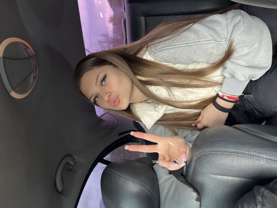The image displays a young female seated in the rear passenger compartment of a vehicle, located in Cherniche, Bulgaria