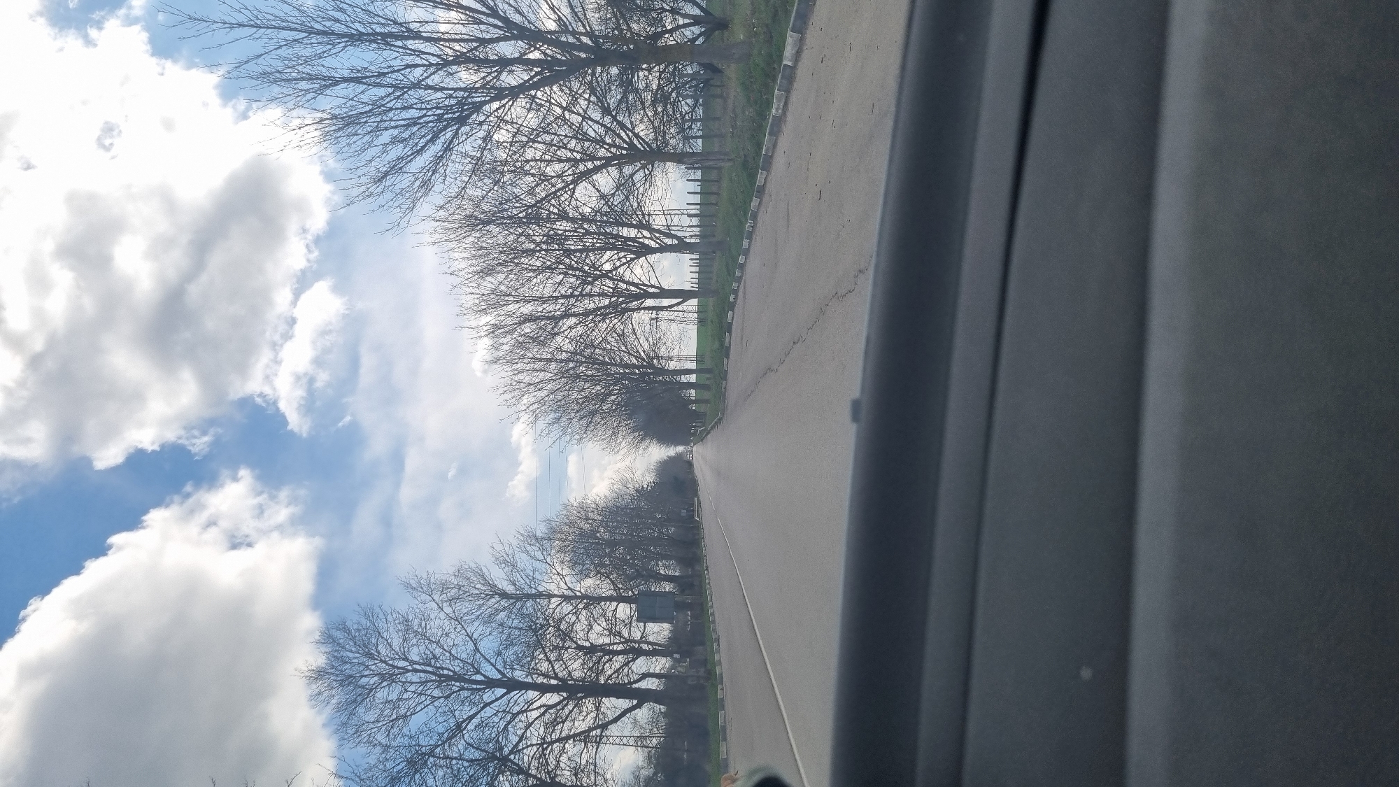 The image provides a forward-facing view from within a vehicle, depicting a two-lane asphalt road extending into the distance under a partly cloudy sky within the city of Valchi Dol, Bulgaria. The road displays a continuous white line on its left margin and is flanked on both sides by rows of leafless deciduous trees. Concrete curbs, marked with alternating white and dark gray sections, delineate the road's edges. Overhead power lines are visible crossing the sky on the left side. A distant white vehicle can be observed on the roadway in the far background. The dark gray, textured dashboard of the viewing vehicle occupies the bottom fifth of the frame, featuring a small bright spot on its left. No human figures are present.
