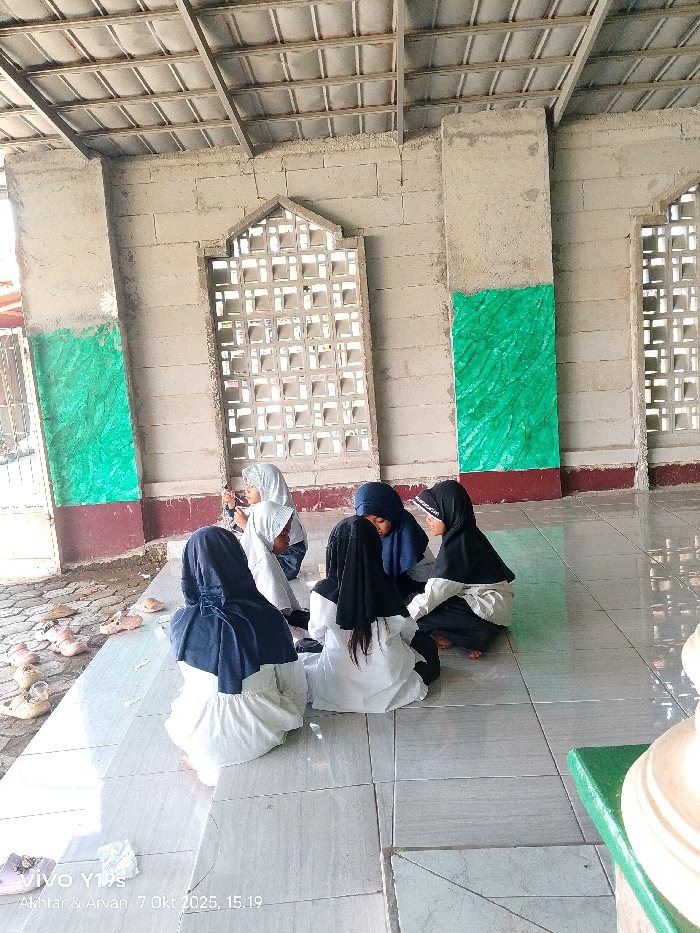 Six young individuals are seated on a light-colored tiled floor within a covered, open-sided structure located in Wanguk, Indonesia