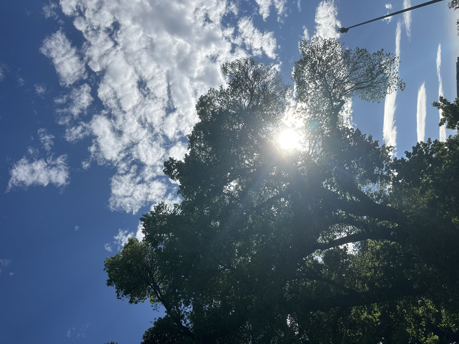 The image presents an outdoor, daytime scene in Carlton, Australia, looking upwards towards the sky and tree canopy. A bright sun, partially obscured by dense green foliage, is located in the upper-middle right, creating a prominent lens flare and illumination. The sky is largely clear blue on the upper left, transitioning to a partly cloudy expanse with scattered white cumulus clouds across the upper right and lower sections. A large tree with abundant dark green leaves and branches occupies the lower and left portions of the frame, silhouetted against the bright background. On the far right, a slender, dark pole, consistent with a lamppost or utility pole, extends vertically into the frame. No individuals, animals, or specific activities are visible.