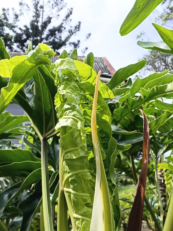 Lush green foliage fills the frame, dominated by large, tropical-looking leaves. A pale yellow, spear-like structure rises prominently amidst the green, contrasting with a darker, brown-colored counterpart nearby. Hints of a building and sky are visible in the background. The leaves have a ruffled texture and appear to be wet, reflecting light. The image captures a close-up, vibrant botanical scene.