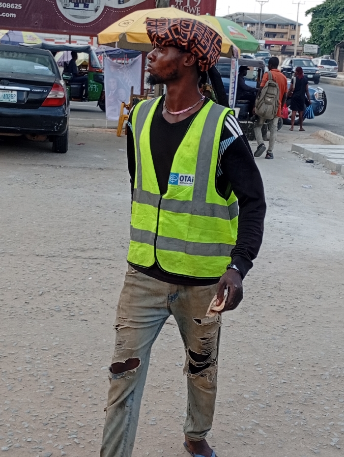 A slender man, wearing a patterned head wrap, stands on a cracked asphalt surface. He sports a neon yellow safety vest over a long-sleeved black shirt and heavily distressed jeans. He holds a small, rolled-up item in his hand. A black car is parked to his left, and an open-air vehicle is visible behind him under an umbrella. People and other vehicles occupy the background street scene.