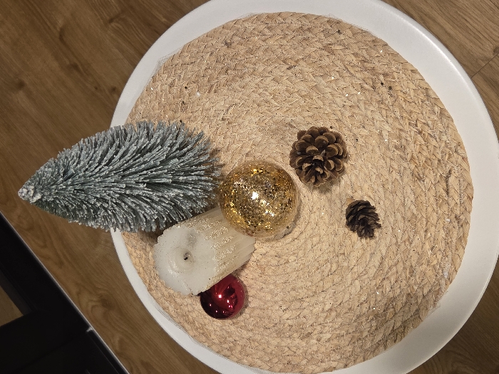 A small, frosted Christmas tree, a partially melted white candle, a glittery gold ornament, and a small red ball are arranged on a round, woven mat. Two pinecones of different sizes sit nearby. The mat is set on a white table. The background includes a wooden floor and a chair.