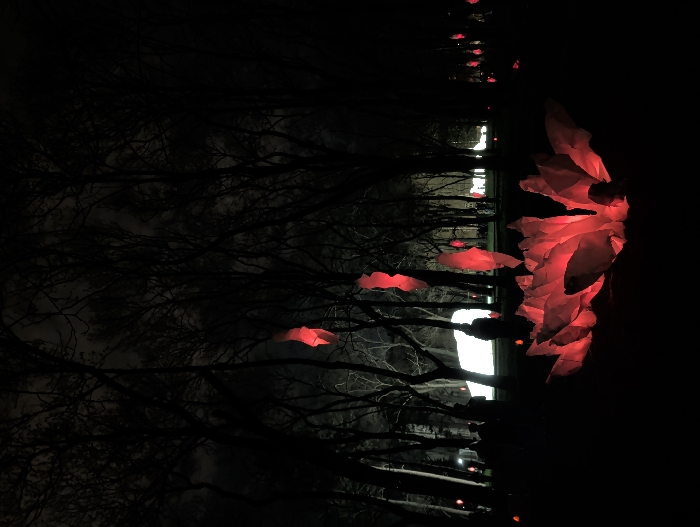 The scene depicts an outdoor light art installation at night in an urban park in Sofia, Bulgaria. In the immediate foreground, a prominent art piece glows with intense red light, forming a multi-faceted, petal-like structure situated on the dark ground. Several other elongated, similarly red-illuminated, fabric-like structures are visible in the mid-ground, appearing to hang from or be integrated with the bare branches of tall trees. Scattered human figures are silhouetted in the mid-ground, their forms indistinct as they move or stand among the installations. Further back, a large, rectangular area emits a bright, uniform white light, illuminating a section of the park. The background consists of a dense arrangement of deciduous trees, their bare branches starkly silhouetted against a dark, cloudy night sky. Smaller, subtle red lights are distributed across the park's darker areas, indicating additional, less prominent illuminated elements. The ground is dark, appearing to be covered in grass or bare earth.