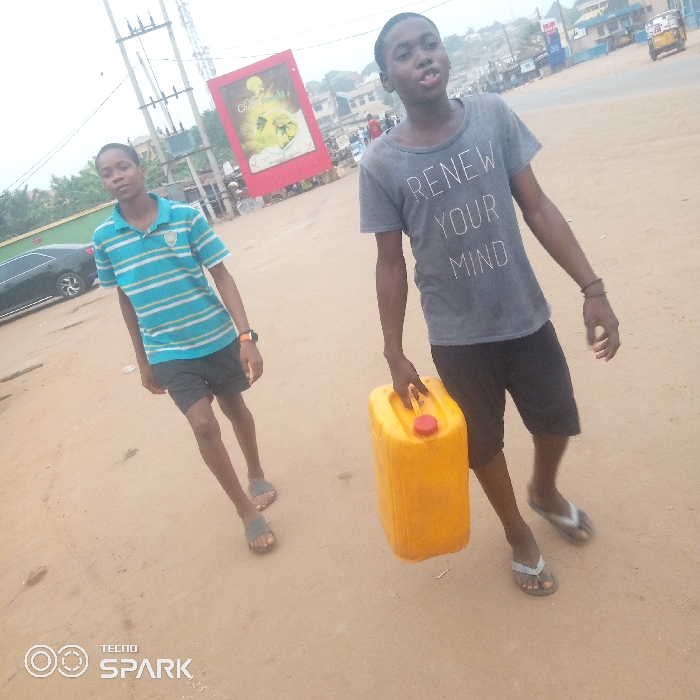 Two young men stand on a sandy surface next to a road. The one on the right carries a yellow plastic container with a red cap. He wears a grey t-shirt with the words "Renew Your Mind" and black shorts. The other boy wears a striped turquoise and blue polo shirt and black shorts. Both are wearing sandals. A black car is parked nearby, and a red billboard is visible in the background. Power lines and buildings are also visible.