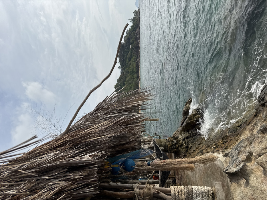 The image captures a coastal view in Baan Sri Thanu, Thailand. The left foreground is dominated by a structure featuring a thick, dry palm frond thatched roof extending downwards. Underneath the thatch, wooden support poles are visible, some wrapped with thick, braided white and beige rope. Blue spherical buoys, sections of netting, and strands of natural fibers hang from the structure. A concrete or paved surface at the base of the structure transitions to a rugged, dark rocky shoreline. Waves of dark blue-green water crash against these rocks, generating white foam. The midground consists of a expanse of blue-green sea with a subtly choppy surface. In the background, a heavily forested landmass, likely a headland or island, is visible, covered in dense green vegetation. Scattered within this foliage are several distant buildings or structures. A narrow sandy beach stretches along the base of this distant landmass. The sky is partly cloudy with patches of light grey and white clouds. No people are present in the scene.
