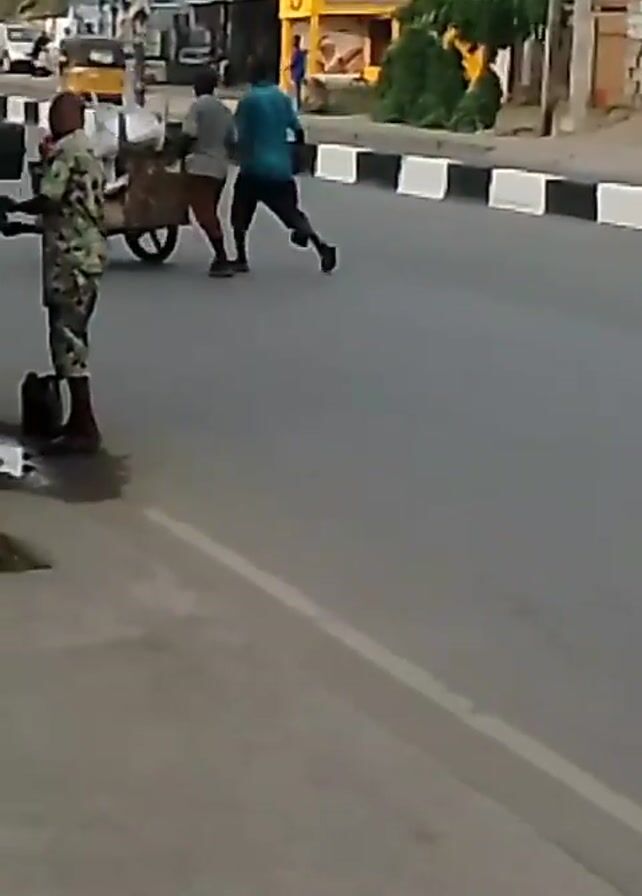 wide shot of a street scene. Two men are pulling a cart across a street with a black and white curb. One man wears a grey shirt and brown pants, while the other sports a teal shirt and black shorts. A third man in camouflage is seen standing on the side of the road next to a blue and green van. He appears to be interacting with the van. The van has a license plate and a logo on its hood. Behind the scene, buildings and trees are visible in the background.