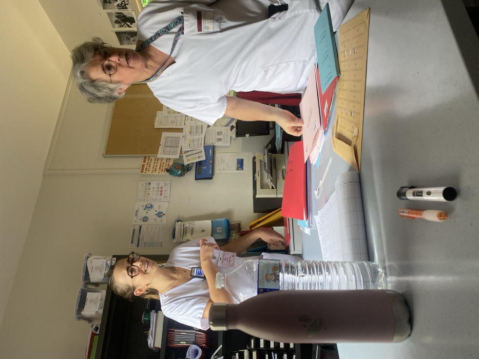 The image depicts an indoor office or administrative setting within a facility located in Tourcoing, France. Two adult females, dressed in white short-sleeved uniform tops with lanyards and ID badges, are engaged in an interaction across a desk. The younger woman on the left, with dark hair and wearing glasses, smiles while facing right. Her right hand is positioned near a printer. The older woman on the right, with short grey hair and wearing glasses, is speaking while facing left. Her right hand rests upon a stack of documents on the desk. In the immediate foreground on the grey desk surface, from left to right, are a rose-gold insulated water bottle, a clear plastic bottle of Cristaline brand water displaying a blue label and a "Bonne Année" sticker, a grid-patterned notebook, a white pen, an orange-tipped pen, and a silver and black pen-like device. To the right, various colored folders (red, light pink, light blue) and a brown envelope with multiple circular perforations are arranged in stacks. The background features a multi-level shelf unit containing assorted items in clear containers, a printer, and a partial view of a computer monitor. The wall behind the individuals is covered with numerous documents, charts, a corkboard, a blue wall-mounted dispenser, and framed photographs. A visible sign on the corkboard reads "ALARME INCENDIE."