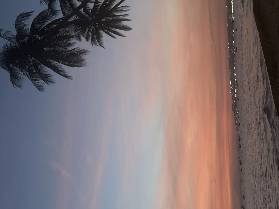 The image displays a coastal scene at dusk or sunset in Thành phố Phan Thiết, Vietnam. The sky, occupying the upper two-thirds of the frame, exhibits a gradient color transition from dark blue-purple at the top to vibrant orange-pink and red hues closer to the horizon, with subtle cloud formations present. In the upper right quadrant, the dark silhouettes of at least two palm trees are visible, extending into the frame with their fronds clearly defined. Below the sky, a large body of water, consistent with a bay or ocean, stretches across the lower portion of the image. The water surface is dark and shows ripples and small waves, particularly in the immediate foreground. Approximately 20-30 small boats or fishing vessels are dispersed across the water, appearing as dark shapes; some exhibit faint lights. Along the distant horizon on the right side, a low-lying landmass is visible, punctuated by numerous clusters of artificial lights, indicating urban development or coastal structures. The immediate foreground consists of a dark, indistinct strip, likely a section of the shoreline or a low barrier, extending across the bottom edge of the image. No individuals or specific actions are discernible within the frame.