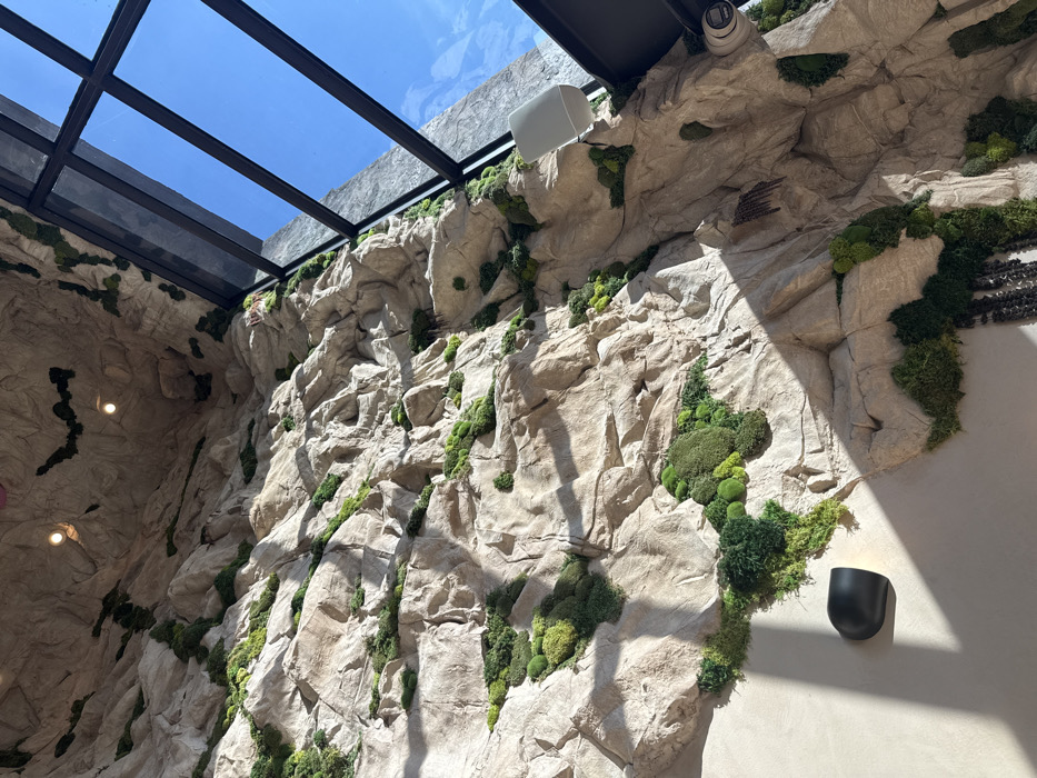 This image depicts an interior architectural feature at Catch LA, a restaurant located in West Hollywood, Los Angeles, California, United States. The dominant subject is a vast, high artificial rock wall, textured in light beige and tan hues, simulating a natural cliff face. Numerous patches of artificial or preserved moss, varying in shades from lime green to dark forest green, are adhered to the rock wall, some forming rounded clusters, others flatter mats. The simulated rock surface extends onto the ceiling, where two recessed circular light fixtures are visible. To the right, large, dark-framed windows or skylights provide ample natural light, revealing a clear blue sky outside and casting sharp, diagonal shadows across the textured rock and moss. A black, half-dome shaped sconce is mounted on a flat, light-colored wall section in the lower-left. Higher on the rock wall, a white wall-mounted speaker and a white dome-style security camera are visible near the window line. Dark, string-like decorative elements hang from a crevice in the rock wall in the lower-middle section. No individuals are present within the scene.