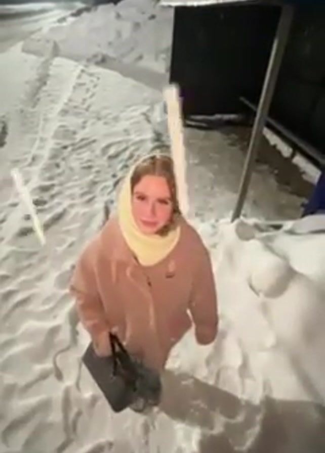 A woman in a light brown coat, light yellow scarf, and dark purse is standing in deep snow in an outdoor area at night