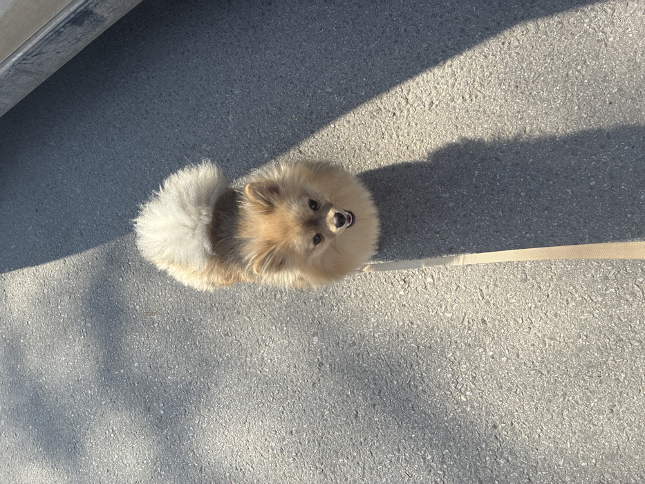 - "The image displays a small, light fawn-colored Pomeranian-type dog standing on a grey, granular asphalt surface" by FM-6xt0I2, licensed under CC BY 4.0