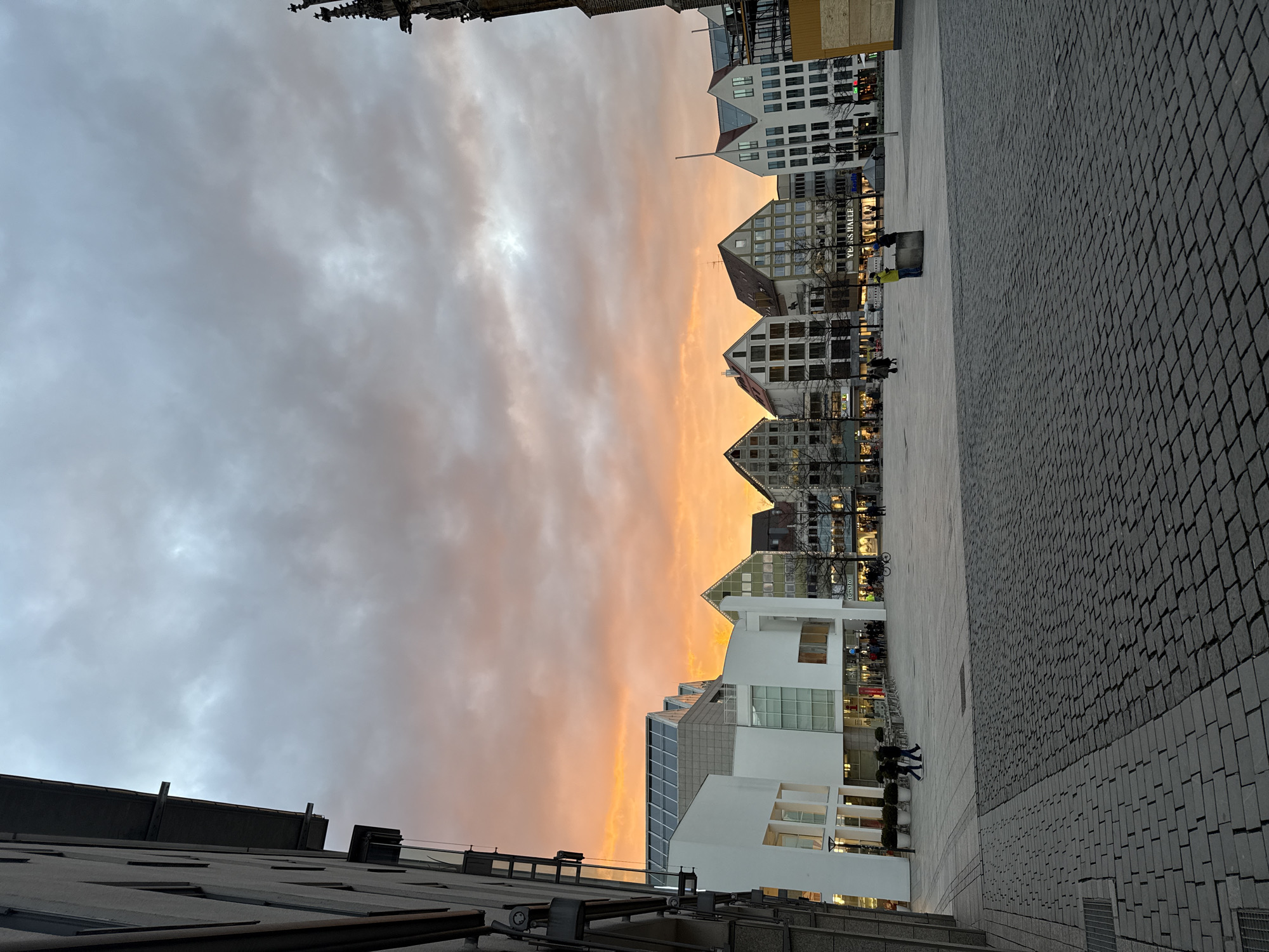 The image depicts an urban square at sunset, identified as Münsterplatz in Ulm, Germany, with the Ulm Minster spire partially visible on the far right. The sky occupies the upper two-thirds of the frame, characterized by dense cloud cover illuminated with prominent orange and pink hues from the setting sun in the center, transitioning to muted grey and pale blue towards the top. The foreground consists of a patterned paved surface, primarily dark grey cobblestones on the right and a smoother, lighter grey paving with a darker border on the left. A dark metal drainage grate is visible in the bottom-left corner. On the far left, a multi-story building with a light grey facade, multiple windows, and dark architectural elements is partially visible, extending upwards from the frame's edge. Adjacent to it, a prominent, modern white building with large rectangular windows and a stepped glass roof structure dominates the left mid-ground. Outdoor seating with tables and chairs is arranged in front of this building, along with several white planters. Two individuals are seen walking from left to right on the paving in front of this white building. Beyond the modern architecture, a row of traditional-style multi-story buildings with distinctive gabled roofs extends across the mid-ground. These buildings feature various facades, window arrangements, and shopfronts, some illuminated from within. Visible signs include "tomato," "YEPTS HALLE," and "Berliner." Bare deciduous trees are interspersed among these buildings. Numerous pedestrians are distributed across the square, engaged in walking or standing. In the center-right mid-ground, two individuals are standing near a dark, rectangular concrete planter or bollard; one is wearing a bright yellow jacket, the other a dark one. On the far right, the upper section of the Gothic spire of the Ulm Minster is visible, showcasing intricate stone carvings and gargoyles against the sky. Below it, a temporary wooden hoarding structure is present at ground level.