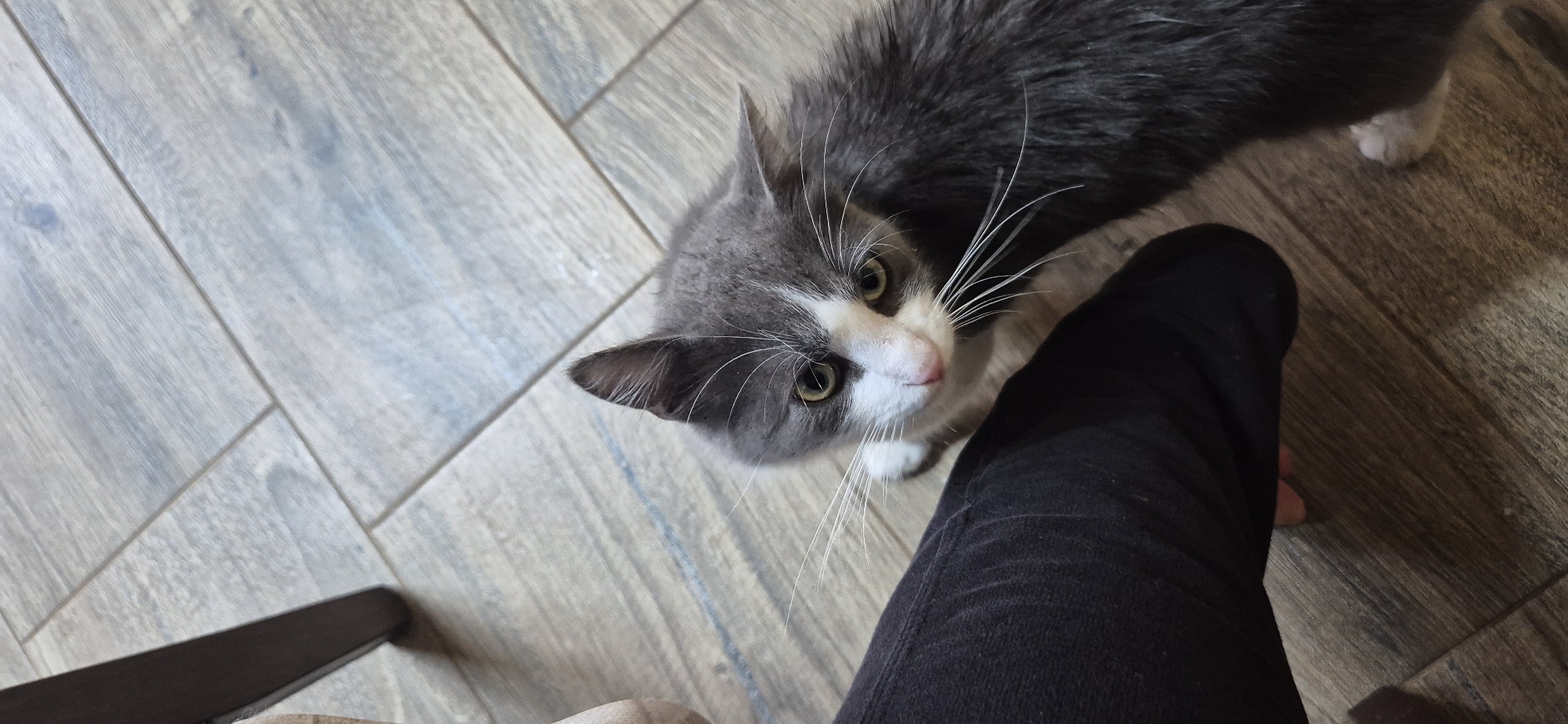 A gray and white cat with green eyes looks up at the camera. The cat is standing on a light gray wood-look tile floor. A person wearing black pants is standing next to the cat. Part of a dark-colored chair leg is visible in the lower left corner. The location is Balgarene, Bulgaria.