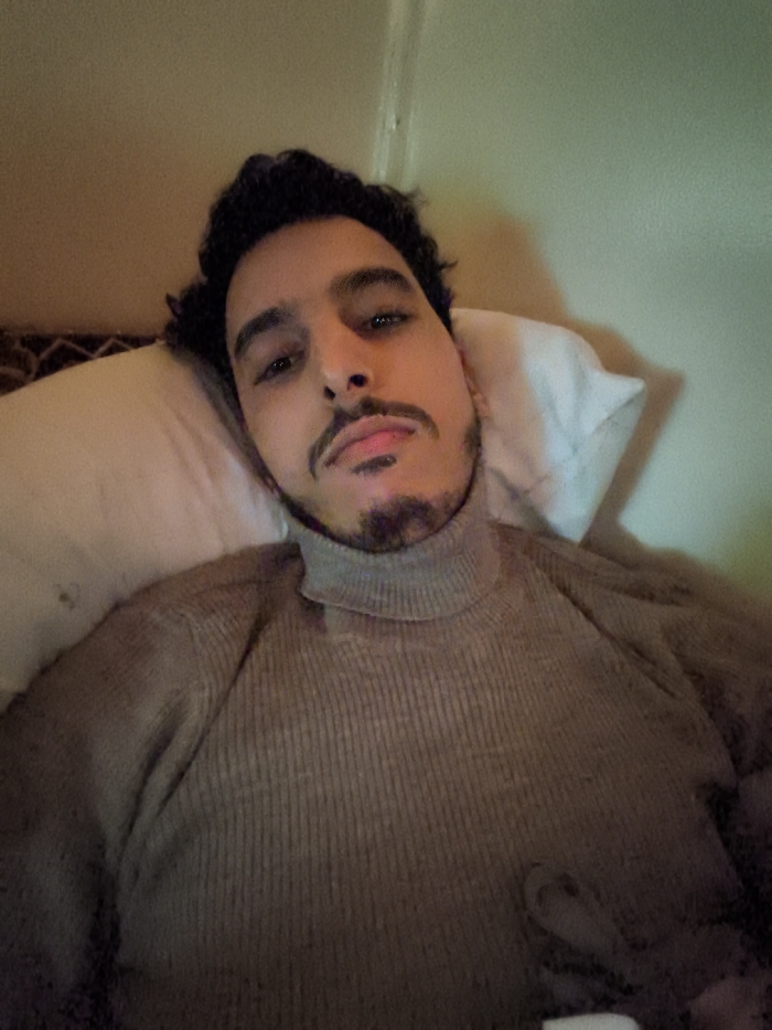 A man with dark hair and a trimmed beard and mustache lies on a white pillow. He is wearing a ribbed, tan-colored turtleneck sweater. The background consists of a light-colored wall and a patterned surface behind the pillow. The man faces the camera directly, his eyes visible. The image has a slightly grainy quality, likely due to low lighting conditions.