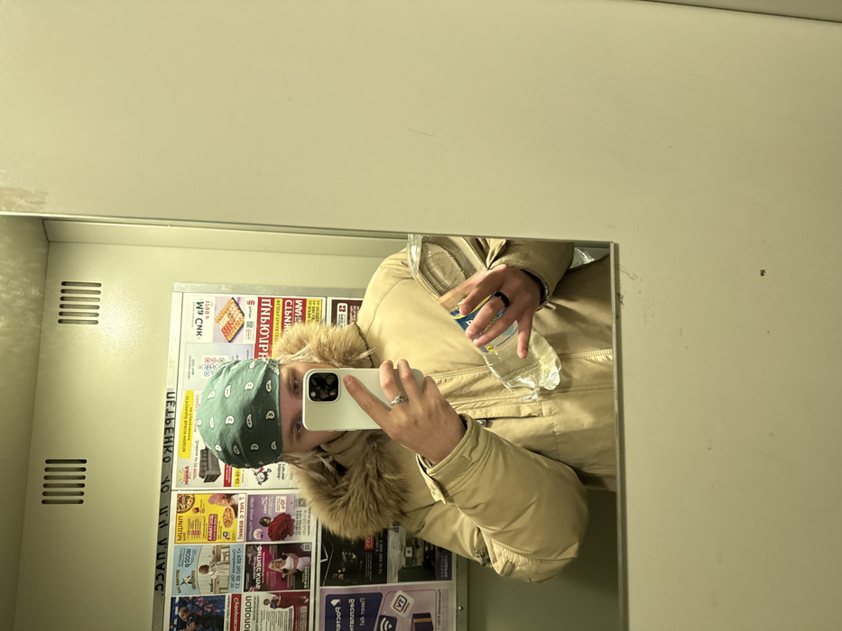 The scene depicts an individual taking a mirror selfie within an enclosed interior space, identified as Rostov-on-Don, Russia, based on visible Cyrillic text including "РОСТОВ-НА-ДОНУ" on reflected advertisements. The subject is an individual with light-colored hair, wearing a light-tan or beige hooded winter jacket featuring a prominent fur-lined collar. A light-green bandana with white paisley patterns covers the subject's head. The individual holds a white smartphone, consistent with an iPhone model, in their right hand, angled to capture their reflection. A silver-toned ring is present on the right ring finger. In their left hand, a transparent plastic bottle partially filled with clear liquid, presumed to be water, is held. A dark-colored ring is visible on the left ring finger. The immediate environment, as reflected in the mirror, consists of a light-colored wall with horizontal ventilation slats at the top. Below the slats, a bulletin board is affixed, densely covered with various paper advertisements and notices written in Cyrillic script. These advertisements include commercial promotions and public information, some displaying QR codes and imagery such as food items (e.g., sushi) and people. The wall to the right of the mirror appears to be a plain, light-colored surface. The overall lighting is artificial and uniform.