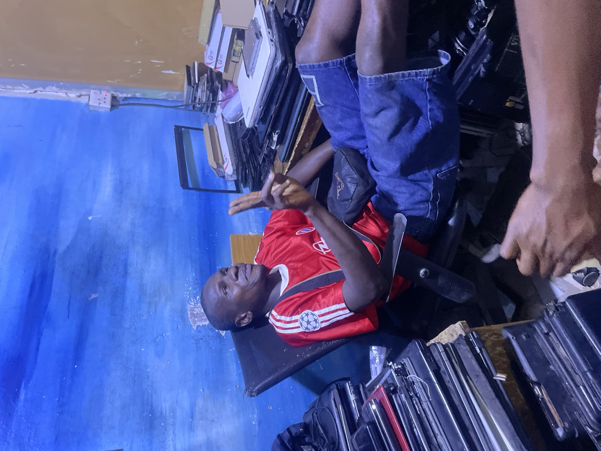 - "Inside a building in Jos, Nigeria, a man in a red shirt is seated and gestures with his hands, surrounded by electronics, predominantly laptops" by FM-zEztV2, licensed under CC BY 4.0
