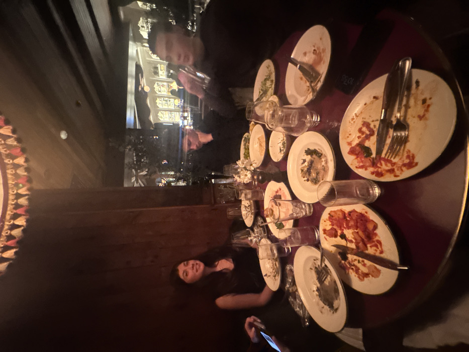 - "A dimly lit restaurant setting displays a round table covered in used plates and empty glasses, indicating a recent meal" by FM-tmcYE2, licensed under CC BY 4.0