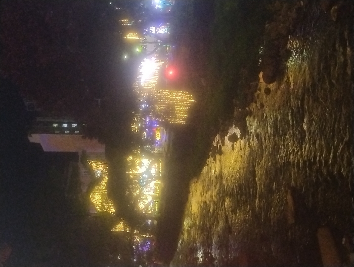 A nighttime scene shows a street aglow with festive lights. Bright yellow illuminations line a thoroughfare, with a single red light punctuating the scene. Dark foliage obscures the view on the left, partially concealing a building. A textured wall or cliff face rises on the right, reflecting some of the warm light. The overall effect is a contrast between the darkness and the bright, concentrated display of light.