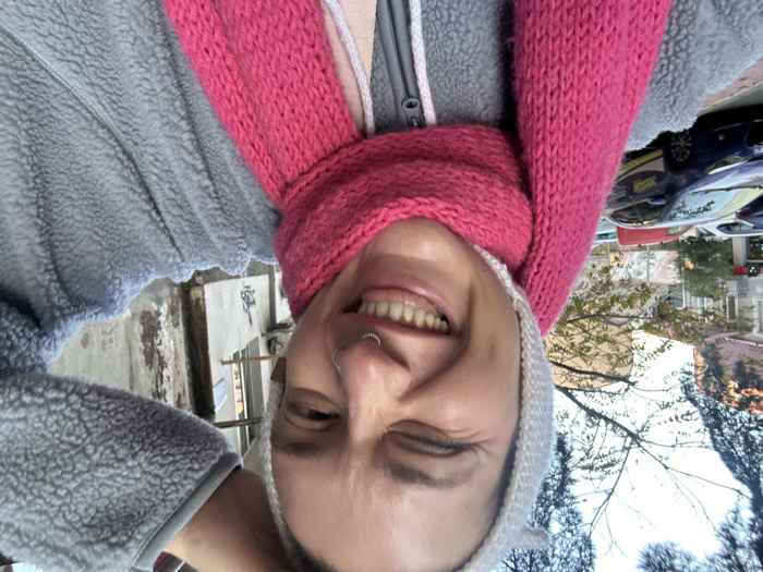 A woman smiles at the camera, wearing a pink knitted scarf and a gray hooded jacket. She has a nose ring on her left nostril. The background shows an urban environment with buildings, trees, and parked cars. The photo is taken outdoors, possibly in a street or public area, with natural lighting. The angle is tilted, causing a skewed perspective.