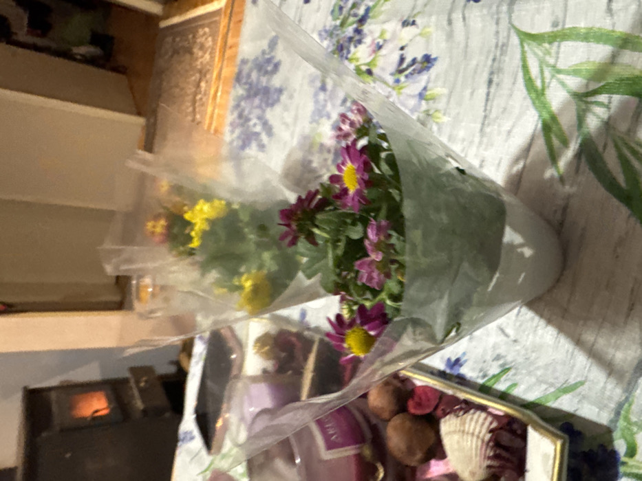 The scene, located in Kameno, Bulgaria, depicts an indoor environment. Three potted plants are centrally positioned on a table covered with a white tablecloth featuring a purple lavender and green leaf pattern. The foreground plant displays small purple and pink daisy-like flowers with yellow centers, encased in clear plastic with a light green base. Two additional potted plants with yellow flowers, similarly wrapped, are visible behind it. To the left, a smartphone with a light-colored case rests near a pink jar candle, partially labeled "AREM." Adjacent to these is a decorative tray containing two brown spherical objects, several small, dark red, textured items, and one larger, ribbed white object. In the background, a dark wood-burning stove on the left emits an orange glow from an active fire. To the right, a doorway leads to another room, where a patterned rug is partially visible on the floor. No people are present.