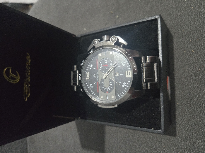 An open black watch box, lined with black velvet, contains a silver-tone wristwatch with a dark grey/black dial
