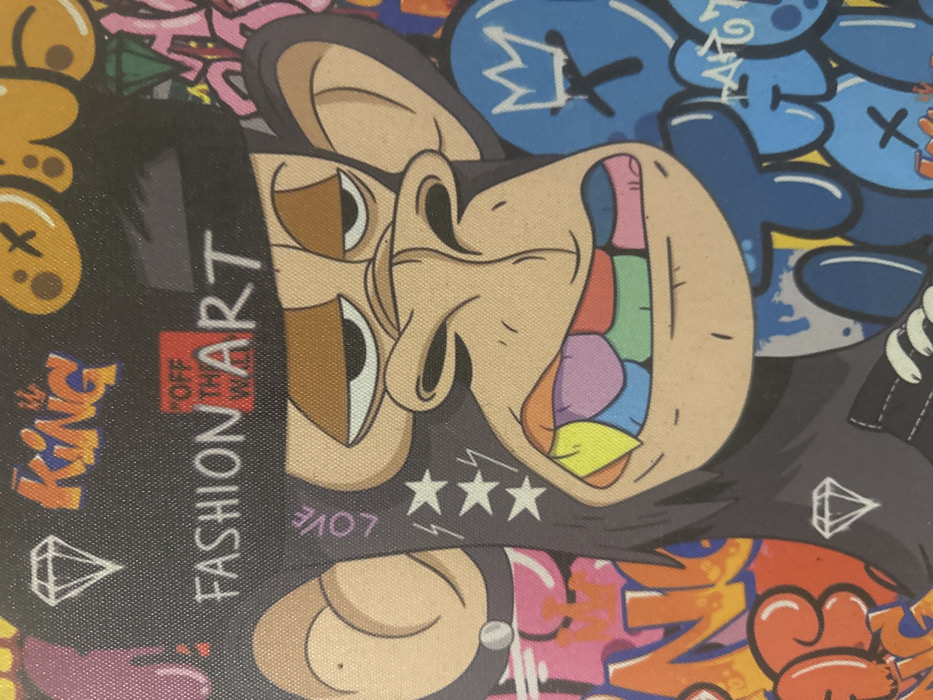 The image displays a stylized, cartoon-like illustration of an ape or chimpanzee, rendered in a vibrant, multi-colored graffiti aesthetic