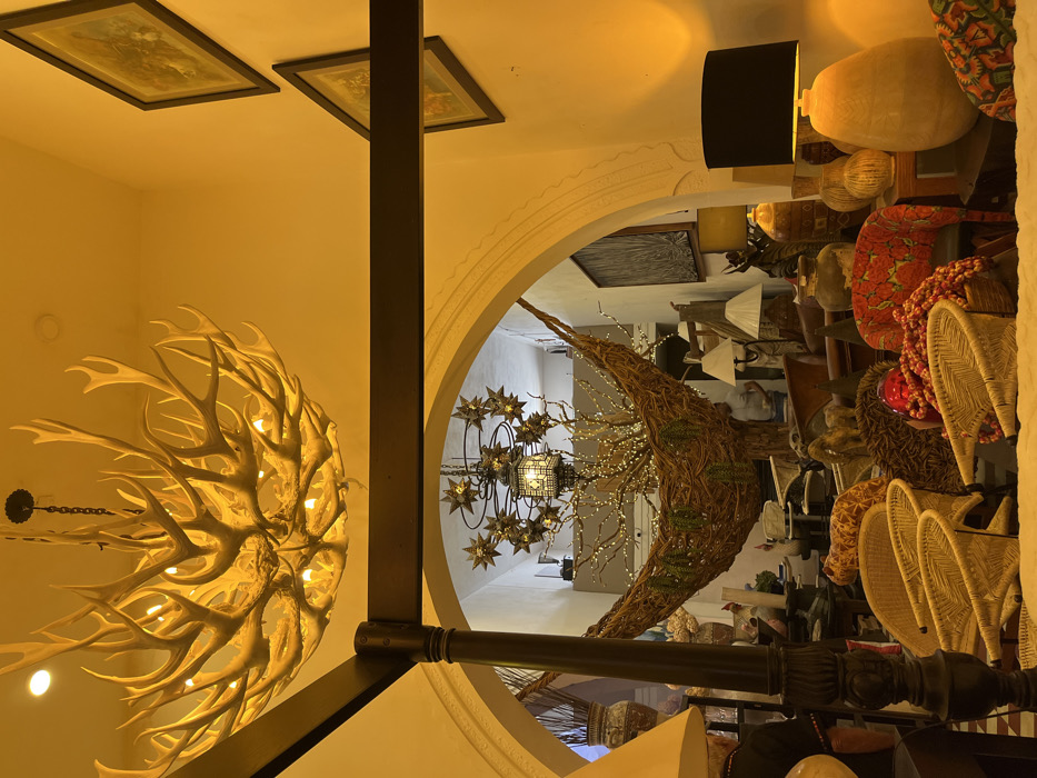 An ornate room features two elaborate chandeliers: one made of antlers, the other with star-shaped lights. Two framed pictures hang on the yellow wall. A thick dark column divides the space. The archway leads to another room, which is filled with objects. A black lampshade and wooden furniture sit next to the archway.