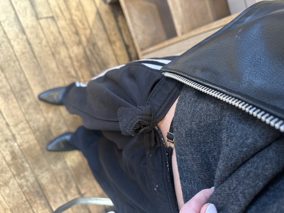 The image presents a high-angle, downward view of an individual from the mid-torso to the feet, located indoors. The person wears a black faux leather jacket with a prominent silver zipper, a dark grey long-sleeved top, and black tracksuit bottoms with white stripes visible on the outer seam of the left leg. The drawstring waist of the tracksuit bottoms is tied in a knot, causing a slight dip in the waistband, which reveals a small section of skin and a gold-colored hook-and-eye clasp, likely part of an undergarment. A hand with light-colored nail polish is visible on the right, lightly touching the grey top. The individual's feet are clad in black pointed-toe shoes. The flooring consists of light-toned wooden floorboards with visible grain. In the blurred background to the left, a light wood shelving unit is partially discernible. The precise location within Tonbridge and Malling, United Kingdom, cannot be determined from the visual evidence provided.