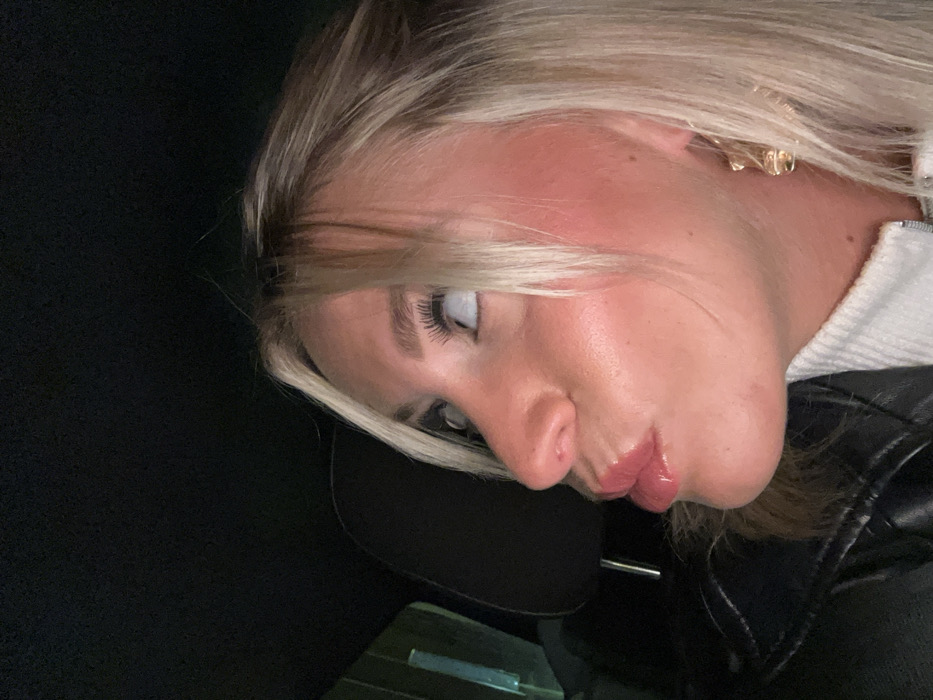 A woman's face is seen in a close-up, angled slightly. She has fair skin, blonde hair with darker roots, and light eyes that glance upward. Her lips are full and glossy. She wears a white sweater under a black leather jacket. A gold earring is visible. The background is dark, with a headrest and a small portion of the car window visible.