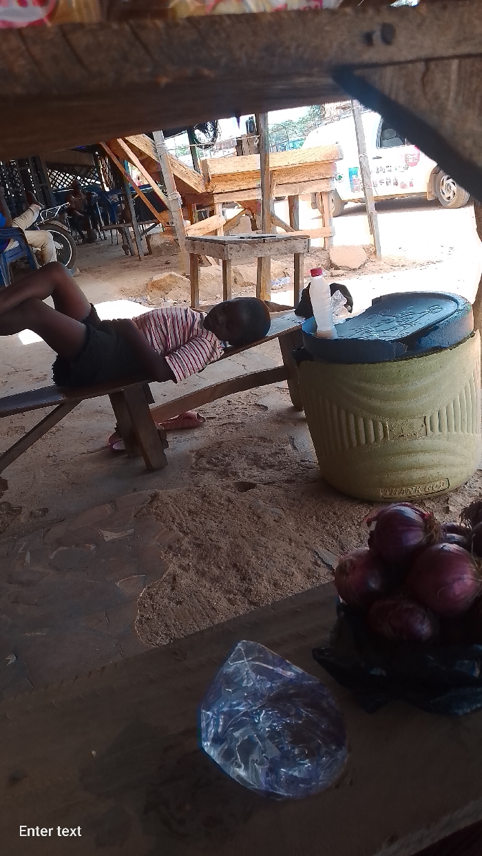The scene depicts an outdoor market or roadside stall environment in Akwanga, Nigeria, viewed from under a wooden shelter