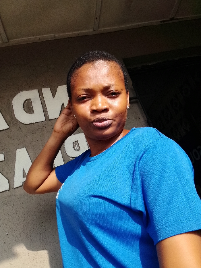 A person with short hair and a blue t-shirt is posing for a photo. The person is standing outside, in front of a wall with white lettering. The person is touching their hair and has a neutral expression. The lighting is bright and creates shadows on the wall. A dark, possibly windowed, area can be seen in the background.
