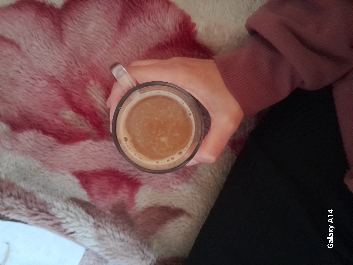 An overhead photograph depicts a human hand holding a clear glass mug filled with a light brown, frothy beverage. The visible part of the person's arm is clad in a reddish-brown long-sleeved garment with a ribbed cuff. Black fabric is present in the lower-left portion of the frame, likely part of the individual's lower attire. The background consists of a soft, textured surface, possibly a blanket or rug, patterned with interwoven cream and reddish-pink abstract shapes. The text "Galaxy A14" is watermarked in the bottom-left corner of the image. The scene is located in Khan Yunis, Palestinian Territory.