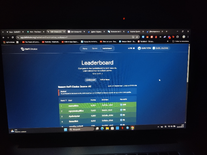 laptop screen displaying a webpage. The webpage is blue and contains text and a table. The text on the webpage states "Leaderboard" and "Season DeFi Choice Season #2". The table displays a leaderboard with rankings, user names, points, and rewards. The laptop is situated in a dark environment with its screen illuminated. The coordinates provided (37.209, -3.618) indicate a location in the city of Granada, Spain. The scene depicts an individual accessing a leaderboard on a DeFi Choice website.