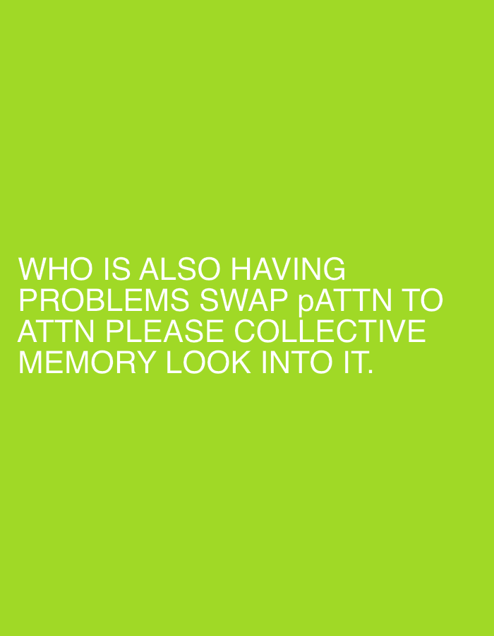 The image displays a solid, uniform lime-green background. Centered horizontally in the lower half of the frame are five lines of white, sans-serif text in capital letters. The text reads: "WHO IS ALSO HAVING PROBLEMS SWAP pATTN TO ATTN PLEASE COLLECTIVE MEMORY LOOK INTO IT." No individuals, animate subjects, physical objects, actions, interactions, or specific environmental features are visually depicted within the image. The scene is situated in the city of Narayi, Nigeria, though no visual elements within the image represent this location.
