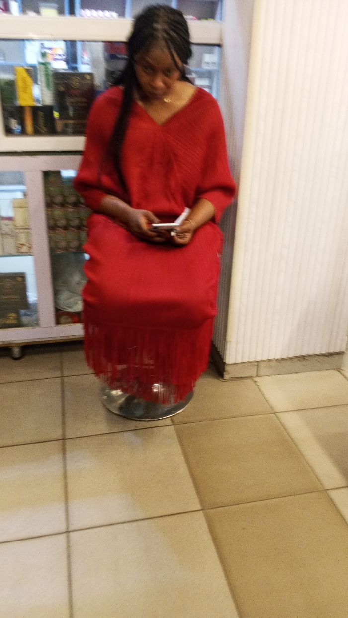 The scene depicts an indoor retail or commercial space within Tarauni, Nigeria. A female individual with dark braided hair is seated on a metallic, chrome-finished stool or chair base. She wears a solid red, V-neck garment, possibly a dress or a long top and skirt, with loose-fitting sleeves and a fringe detail along the bottom hem. A slender, light-colored necklace is visible around her neck. She is looking downwards, focused on a white smartphone held horizontally with both hands. To her left, a light-colored display cabinet with glass doors and shelves holds various packaged products and bottles, visible but out of focus. To her right, a vertical, light-colored, ribbed panel or column is present. The floor is tiled with light-toned, square tiles, displaying visible grout lines and subtle reflections from overhead lighting.